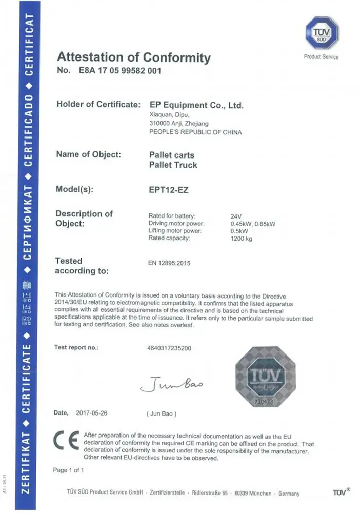 Сертификат EP-Equipment качество вилочных погрузчиков